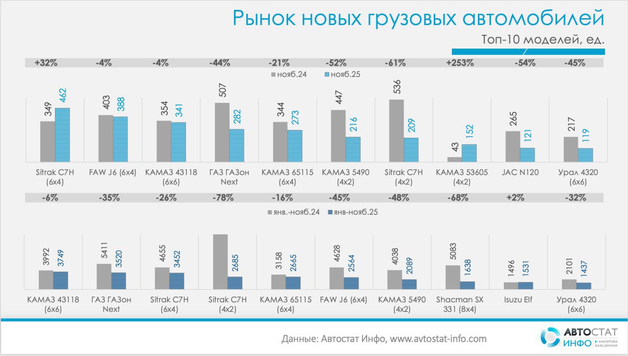 Согласно данным «Автостат Инфо», рынок новых грузовиков по итогам 2025 года продолжает сужаться: в ноябре было реализовано лишь 5 071 единица грузового транспорта, что на 46% меньше, чем год назад (9 399), и на 21% меньше, чем в октябре (6 411). За одиннадцать месяцев 2025 года продано 54 835 новых грузовиков — это на 53% меньше, чем за аналогичный период 2024 года (117 479), и лишь немного превышает результаты за десять месяцев 2025-го, когда отставание составляло 54%. Фактически рынок коммерческого транспорта достиг дна: два месяца подряд объёмы продаж находятся ниже 6 тысяч единиц, в то время как в конце 2024 года они превышали 8,5 тысячи в месяц. Декабрь не смог укрепить октябрьский рост спроса, и итоговый объём года всё больше определяется не цикличностью, а резким снижением инвестиций в обновление автомобильного парка.