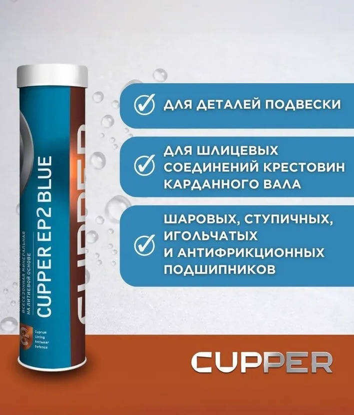 Cupper EP 2 BLUE – синяя высококачественная металлоплакирующяя пластичная смазка, предназначенная для смазывания высоконагруженных узлов трения, шариковых, ступичных, игольчатых и антифрикционных подшипников, поверхностей скольжения, деталей подвески, шлицевых соединений крестовин карданных валов автомобилей и прочей техники, в том числе тяжелой железнодорожные локомотивы, вагоны, подвижные составы, грузовой и прицепной автотранспорт, промышленное оборудование и т.д..
